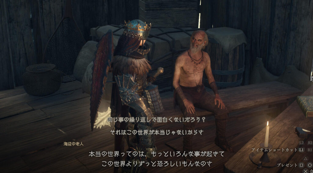 物語の中で「海の老人」というNPCが登場します。彼はメインストーリーには絡みませんが、少し不思議な存在として描かれます。「この世界は本当の世界ではない」と言い、海の向こうへ渡ろうと船を出し続けています。