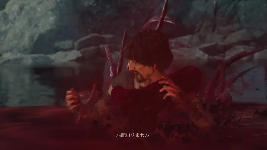 川に落ちたポーンは、水中から現れた赤い触手のようなものに絡め取られます。しかし彼は、自分は死なないから大丈夫だと言い残し、水底へ引き込まれていきます。