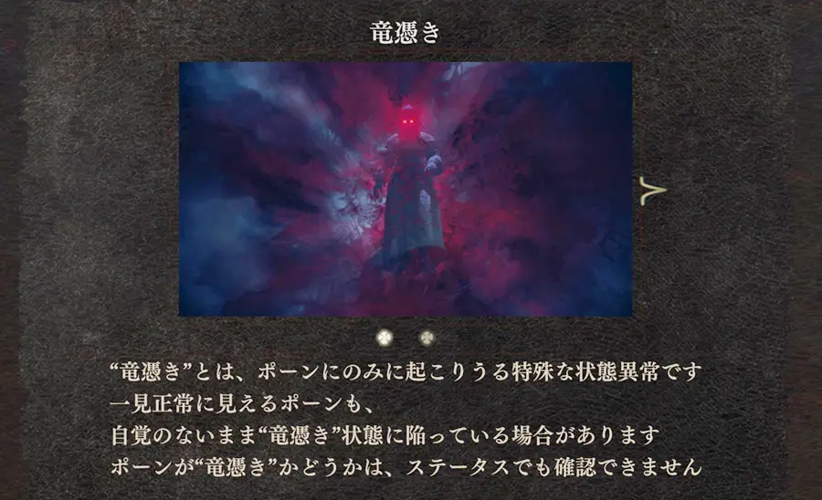 龍憑きは、ドラゴンズドグマ2の評価を下げる大きな要因になったシステムです。ポーンを召喚すると、なぜか一定の確率でバッドステータス状態になります。龍憑きになったポーンは覚者の命令を聞かなくなったり、頭痛に襲われたり、やたらハイになったりと様子がおかしくなります。症状を放置すると、やがて他のNPCを虐殺しはじめたりもします。龍憑きを解除するには、ポーンをロストさせるか、他のポーンに感染させる必要があります。