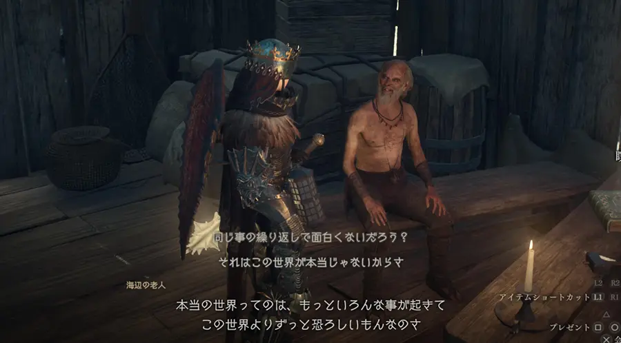 物語の中で「海の老人」というNPCが登場します。彼はメインストーリーには絡みませんが、少し不思議な存在として描かれます。「この世界は本当の世界ではない」と言い、海の向こうへ渡ろうと船を出し続けています。