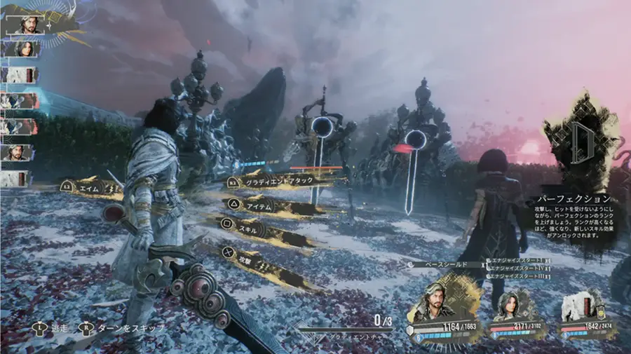 ルックはペルソナのような戦闘画面で、最大3人までが参加可能です。最も特徴的なのは、敵の攻撃を『回避』と『パリィ』で完全に無効化できる点です。これは完全にアクションゲームの文脈であり、コマンドRPGに折り混ぜるというのは新しい試みだと感じました。