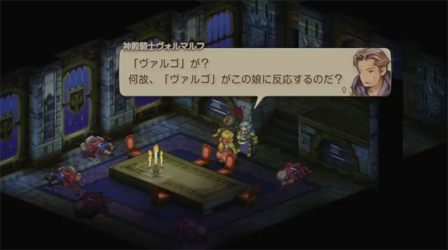 そこへヴォルマルフが現れ、目撃者のアルマを殺そうと歩み寄ります。しかしその時、ヴォルマルフの持っていた聖石ヴァルゴが輝きます。オーボンヌ修道院から奪われ、イズルードが持っていたはずのヴァルゴは、バリンテンに奪われる前に彼の手に渡っていたのです。