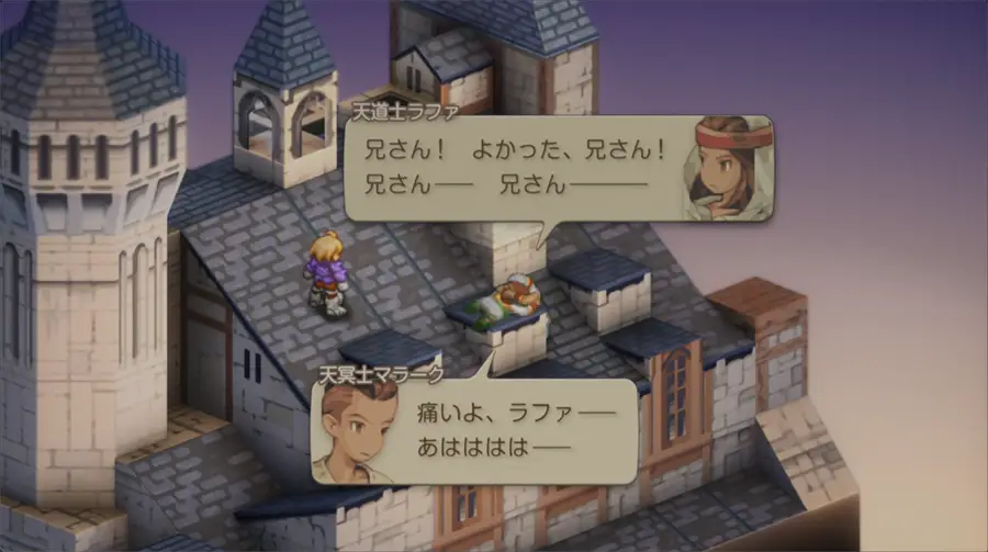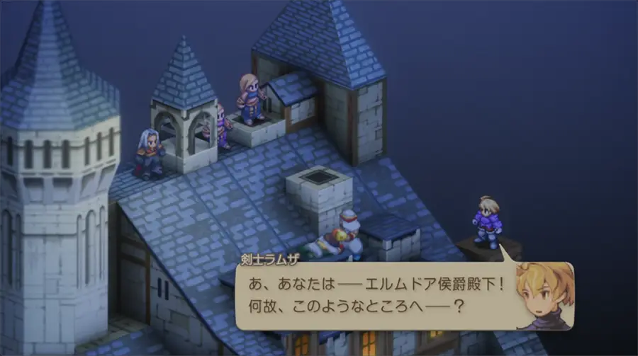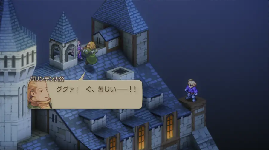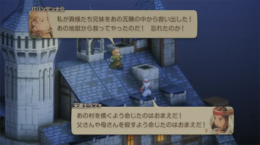 ウィーグラフを退けたラムザたちは、神殿騎士団を追います。そして日も暮れた頃、単独で行動していたラファが、屋上でバリンテン公を発見します。どうやら彼は、ヴォルマルフからかろうじて逃れていたようでした。ラファは、魔導士の才能を持つ自分たちを手に入れるため、故郷を焼き払ったバリンテン公に復讐するのだと言います。