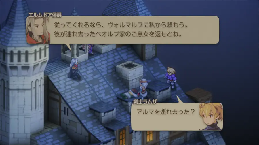 最悪の事態を阻止し、オルランドゥ伯の助力を得たラムザたちは、エルムドア侯が待つというランベリー城を目指します。エルムドア侯爵は、リオファネス城で対峙した際「聖石を渡せばアルマの返還をヴォルマルフに頼んでみよう」と言っていました。それは少なくともエルムドア侯爵がヴォルマルフと近しい人物であり、アルマの居場所を知っている可能性があるということです。