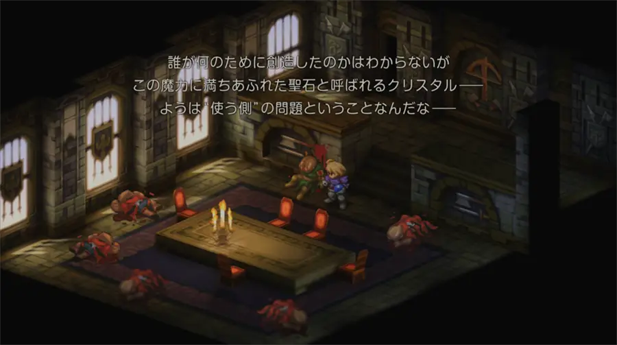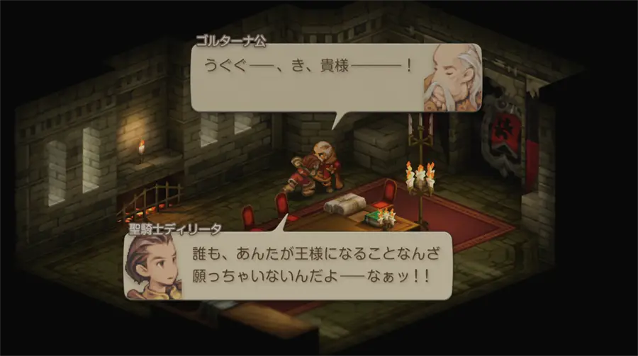 ディリータは、あらかじめ待機させておいたオルランドゥ伯の影武者を入室させると、これを切り伏せます。ゴルターナ公の暗殺はオルランドゥ伯の仕業であり、その後自決したと偽装するためでした。ディリータは、ラムザがオルランドゥ伯を連れ出したのも計画の一部だったことを匂わせます。