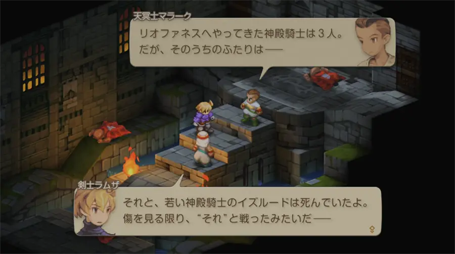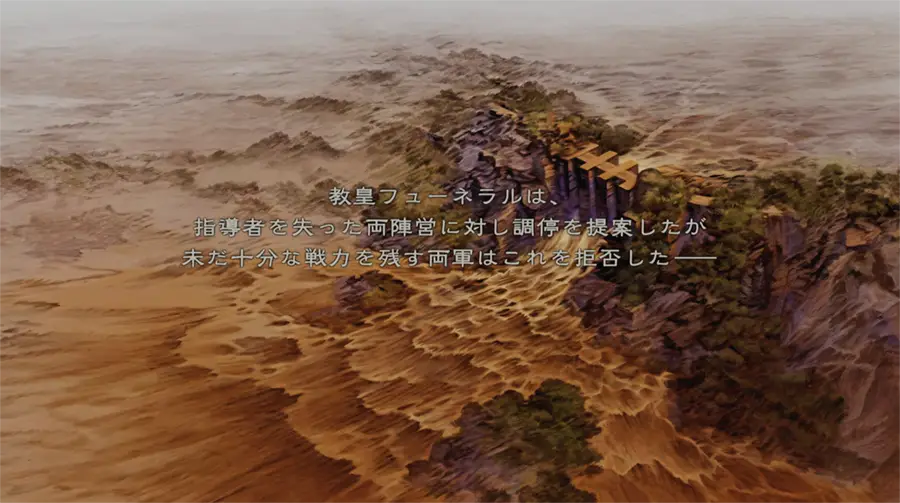 戦いを終えた二人の元に、ディリータの仲間であるバルマウフラが現れ、北天騎士団がベスラ要塞に進軍したことを知らせます。ラムザは衝突を阻止すべくオルランドゥ伯の説得に向かうと告げ、ディリータと握手をして別れます。