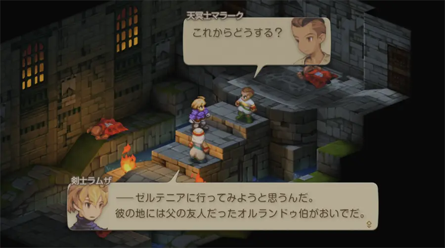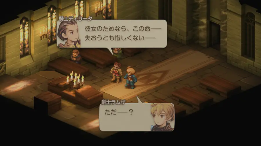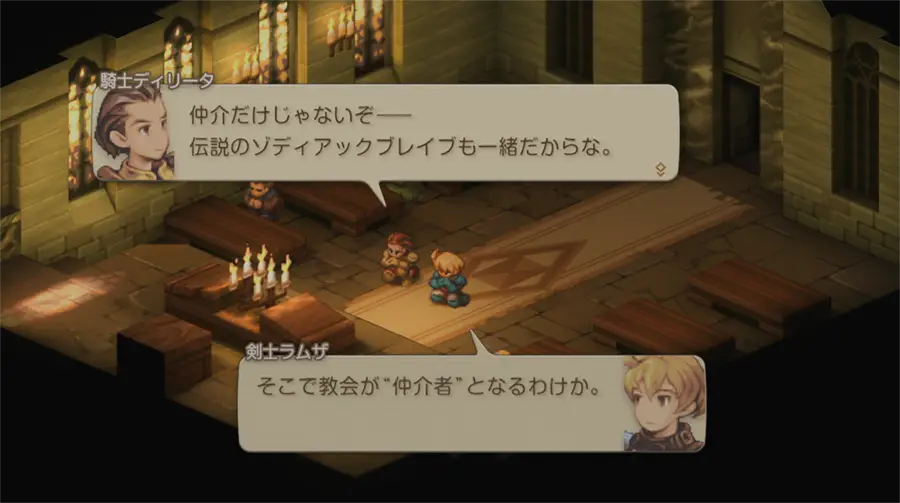 ゼルテニアを訪れたラムザは、教会で祈りを捧げていました。そこに狙い通りディリータが現れます。ラムザは、ディリータがなぜゴルターナ陣営にいるのかと質問すると、ディリータはオルランドゥ伯とゴルターナ公を暗殺するためだと答えます。