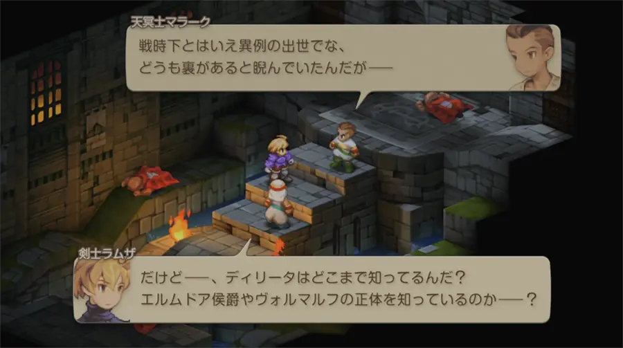 ラムザが去ると、バルマウフラは「親友すら利用するのか」とからかい、ディリータはその言葉に激昂します。沈着冷静なディリータも、ラムザを利用することには穏やかでない感情を抱いているようでした。