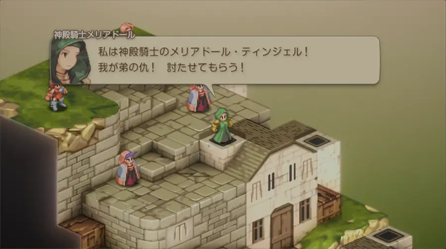 オルランドゥ伯に会うためゼルテニアに向かうラムザたちを、神殿騎士団が待ち構えていました。彼女はメリアドールと名乗り、イズルードの姉だと言います。弟の死がラムザの仕業だと思い込んでいるメリアドールは、その仇をとるため、異端者のラムザを倒しにきたのです。ラムザは、彼女の父であるヴォルマルフがルカヴィであることを伝えますが、やはり信じてもらえません。しかし、教会の陰謀に異を唱えるラムザの言葉には、躊躇が見て取れました。ラムザたちはこれを退け、足を進めます。