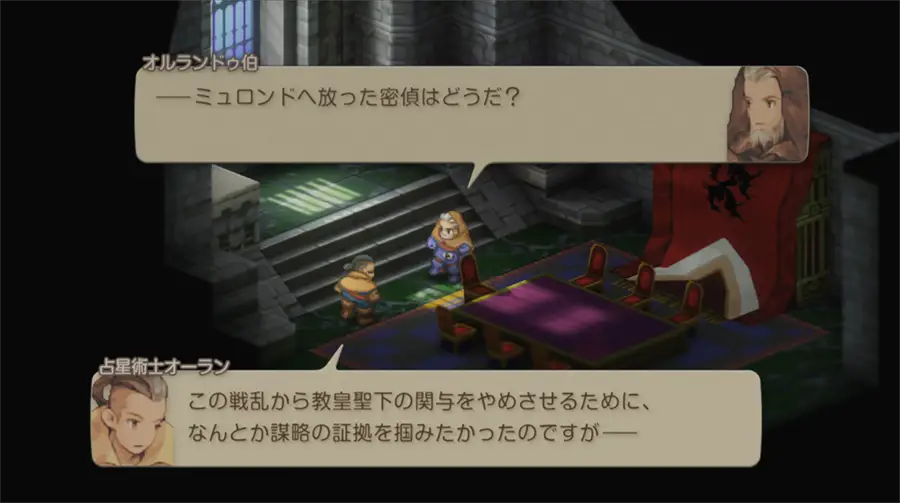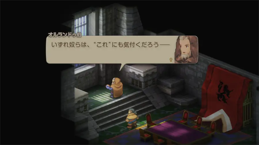 一方ゼルテニア城では、調査から戻った養子のオーランを、オルランドゥ伯が迎えます。疲弊した戦線に頭を抱えるオルランドゥでしたが、既に教会の動きについて把握しており、それを阻止しようと独自に動いていたのです。しかし、証拠は掴めず、身動きが取れない状況でした。オーランは、ラムザが神殿騎士と対立していることや聖石の行方など、かなり詳細な情報を得ており、それを報告します。