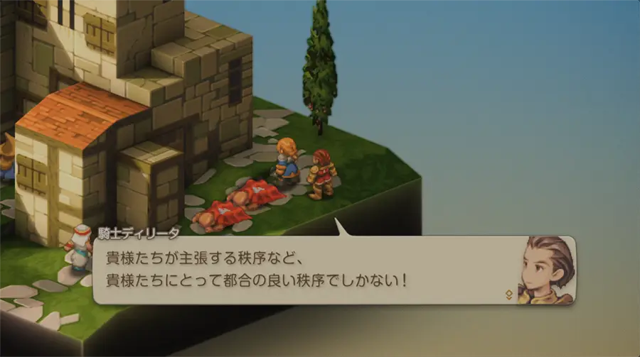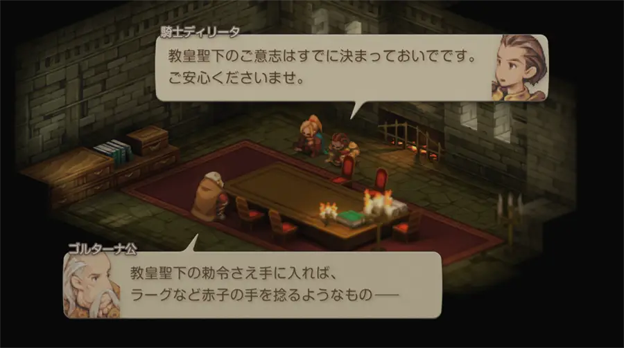 しかし、ディリータの真の目的は、唯一の王としてオヴェリアを立てることにあると言います。そのために教会を利用しているからこそ、暗殺計画の全貌をラムザにバラしたのでした。それは同時に、教会も含めた覇権争いを認めないということであり、大筋として二人の目的は同じ方向を向いていると言えました。