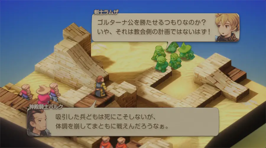 オルランドゥ伯を追ってベスラ要塞へ向かうラムザたちは、道中のベッド砂漠で作戦中の神殿騎士バルクと遭遇します。彼らは北天騎士団の陣地に向け、毒を散布していたようでした。毒に致死性はないものの、体調不良は免れません。そうなれば戦いどころではなくなります。