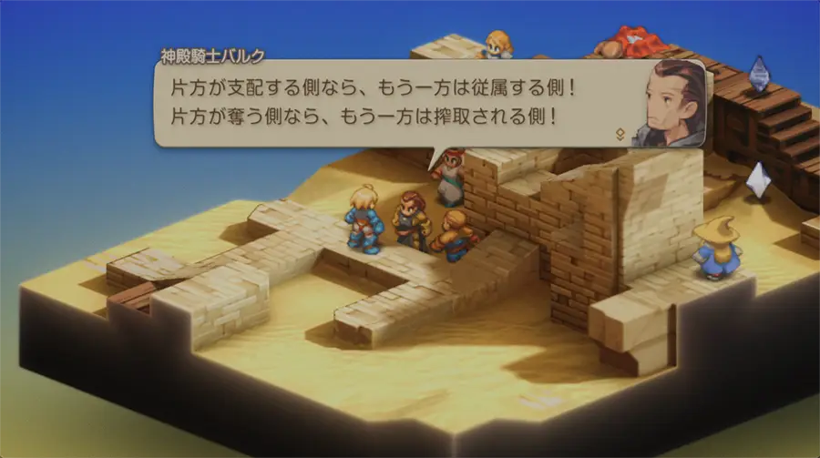 バルクは、人間は必ず「搾取する側」と「される側」に二分され、それを覆すことはできないと言います。しかしラムザは、そのロジックでは闘争が繰り返されるだけで、貴族たちと変わらないと反論します。ラムザはバルクを退けますが、既に毒は北天騎士団に向けて撒かれたあとでした。