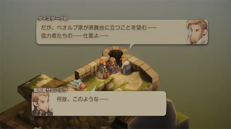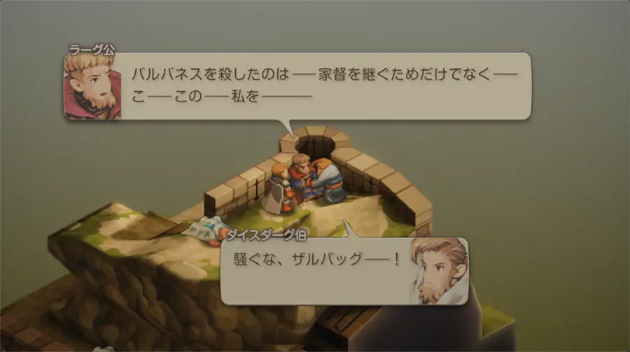 兄の凶行を目の当たりにしたザルバッグはその理由を問いますが、ダイスダーグはベオルブ家のためだと答えます。ラーグ公は勇敢に戦って戦死し、ベオルブ家に意志を継がせたとすることで、権威を担保できると言います。あまりの出来事に疑念を抱くザルバッグでしたが、もはや後には引けない状況になっていました。