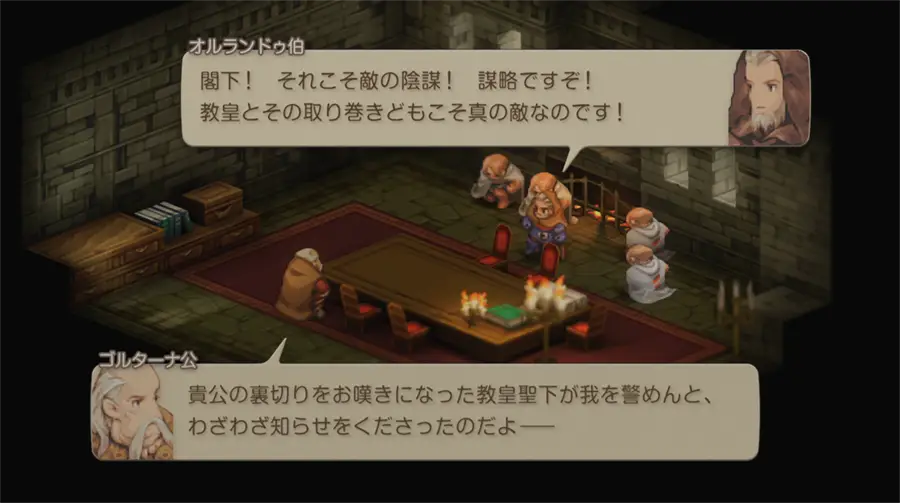 入れ替わりに入室したのは、ディリータとバルマウフラでした。教会との交渉役という立場を利用し、オルランドゥを罠にかけたのです。かつてグルワンヌ大臣を使って戦争を煽ったのと同じ手口でしたが、既に術中にハマっていたゴルターナ公は、ディリータを疑うことはありませんでした。彼が取り付けたという皇帝からの勅命は、ゴルターナ公の目をくらませるのには十分だったのです。
