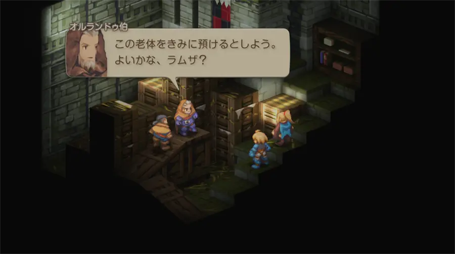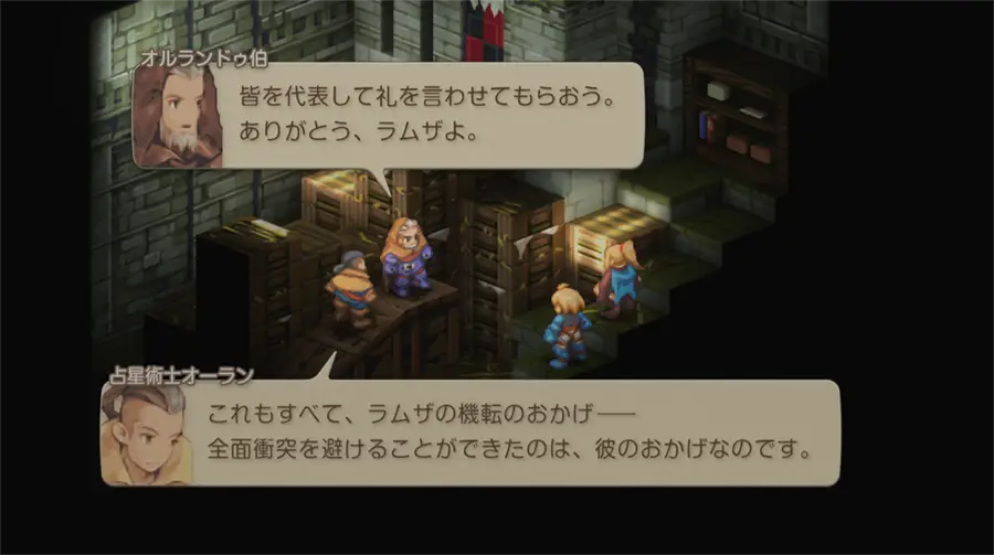 戦闘を硬直状態に持ち込んだラムザはバルマウフラと合流し、オーランの案内でオルランドゥ伯が幽閉されている穀物倉に向かいます。オーランはラムザの機転によって戦闘が停止したことを伝えます。オルランドゥ伯は、成長したラムザの姿に、親友バルバネスの面影を見るのでした。