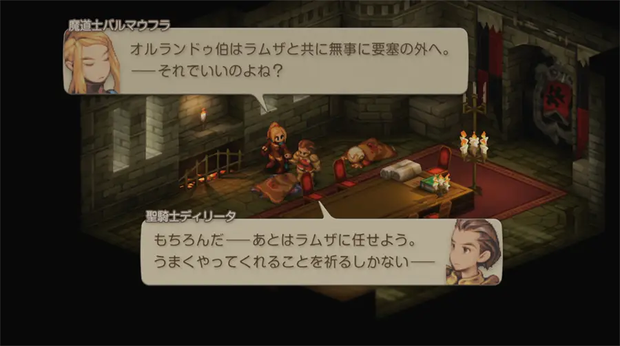自身の野心のためにオヴェリアを利用しようとしているのかと問うラムザに、ディリータは「彼女のために命を賭す覚悟」だと答えます。そのシンプルな動機を口にするディリータを、ラムザは信用することにします。
