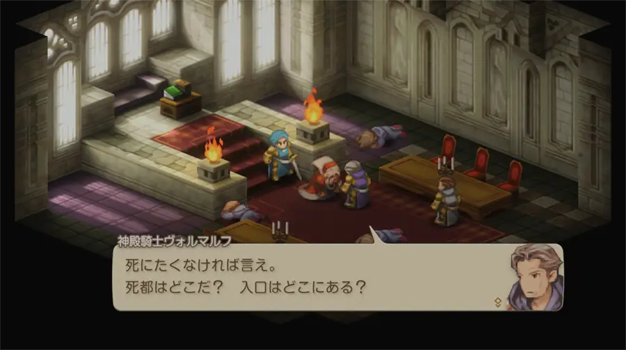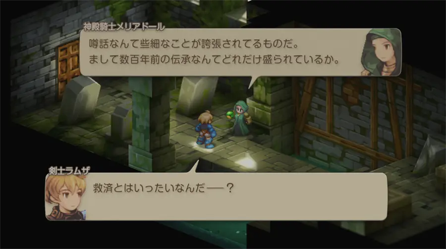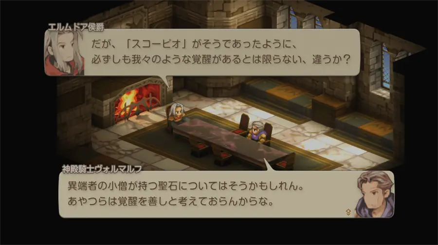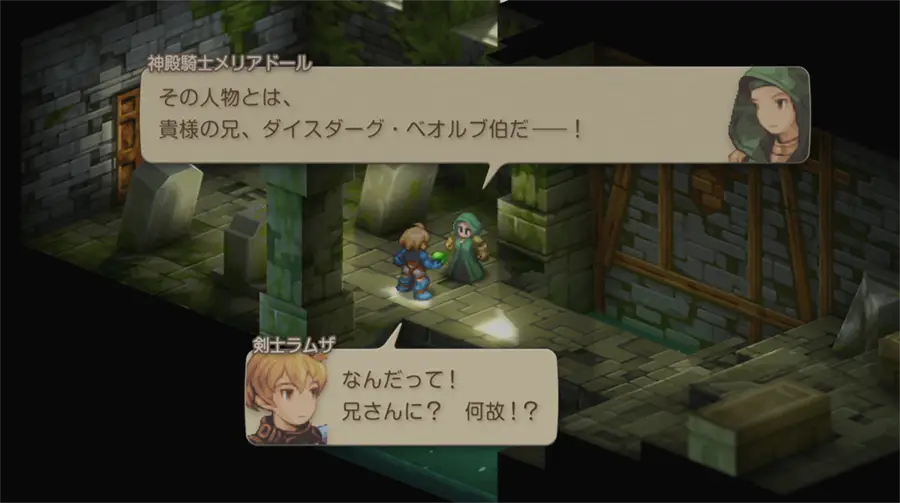 するとその時、神殿騎士のメリアドールが部屋を訪れます。彼女は目の前の事態に驚愕し、ラムザが言うルカヴィと聖石の話が事実だったことを理解します。ラムザは、ウィーグラフやドラクロワ枢機卿も同じようにルカヴィと化したこと、そしてイズルードがその事実に気づいて討ち死にしただろうことを伝えます。それは同時に、彼女の父であるヴォルマルフも、既にルカヴィである可能性を示していました。
