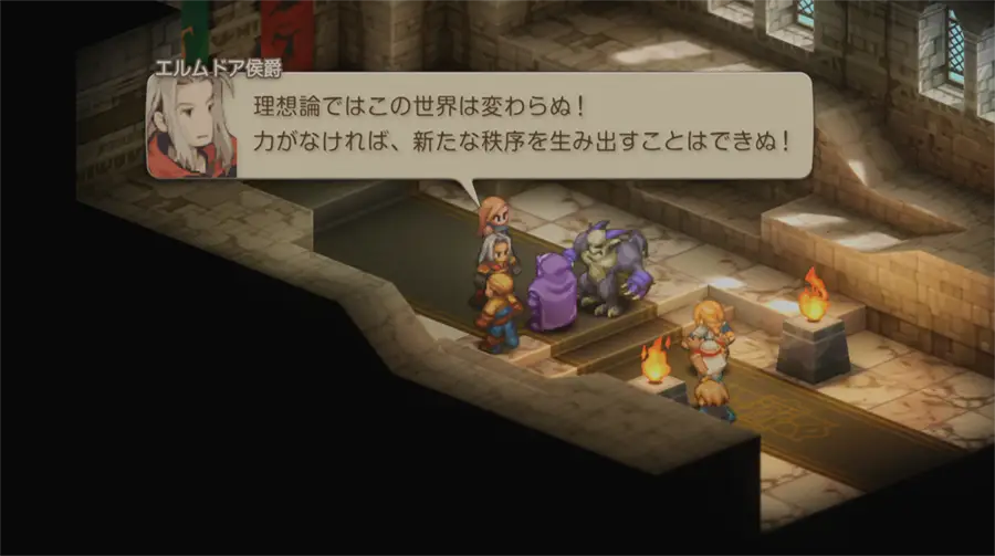 一方、ランベリー城へ到着したラムザたちは、それを迎え打つエルムドア侯爵と対峙します。あくまで聖石の譲渡を求めるエルムドア侯爵でしたが、相手がルカヴィだと知っているラムザに迷いはありませんでした。旧知であったエルムドア侯とオルランドゥ伯は、互いに認め合いながらも剣を交えます。
