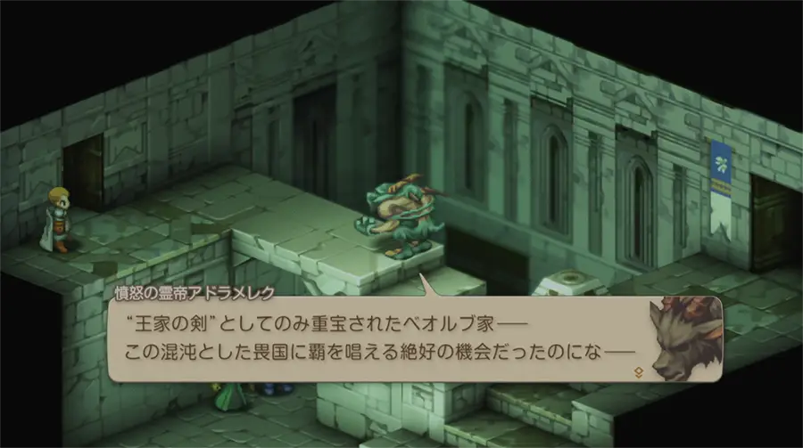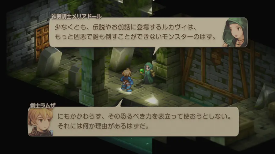 ラムザはメリアドールに状況を説明しながら、ルカヴィの絶大な力を表立って使わない理由に疑問を感じます。不死身の怪物というイメージを保持すること以外に、なんらかの目的があるのではと考えます。