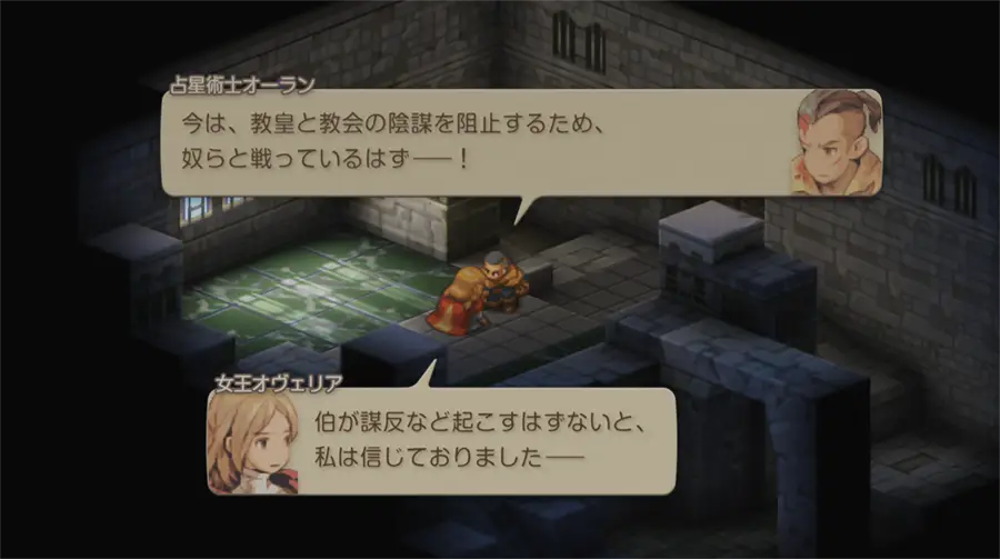 そのとき、部屋の扉が開かれます。そこに現れたのは、ディリータとバルマウフラでした。そして、オーランの言っていたことを裏付けるように、ディリータは事の真相を話します。オヴェリアは、全てを利用しようとするディリータに憤りますが、誰からも人として扱われない彼女にとって、唯一の拠り所がディリータであることも確かでした。