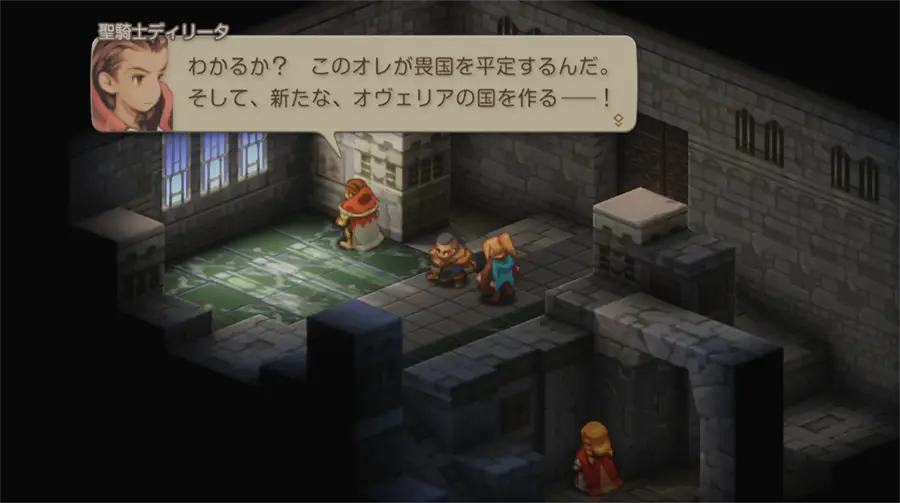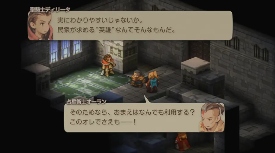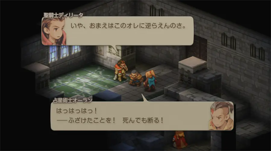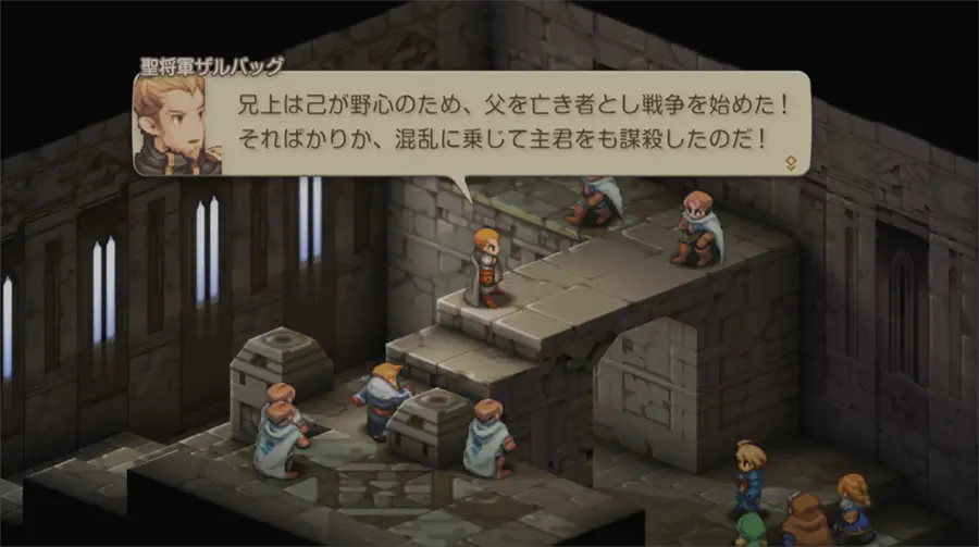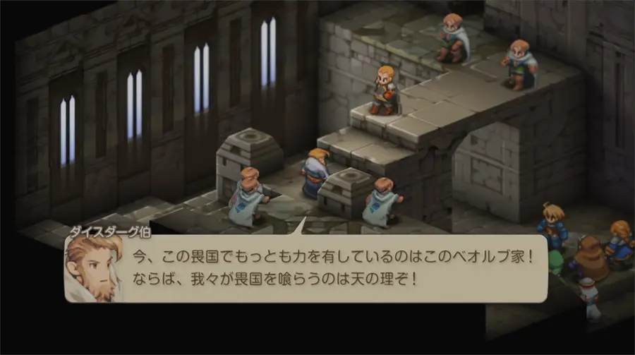 ダイスダーグは、戦後弱体化した王家に代わり、軍事力を持つベオルブ家が台頭するのは当然だと主張します。もはや説得は不可能だというザルバッグの言葉に、ラムザは兄を手にかけることを覚悟します。