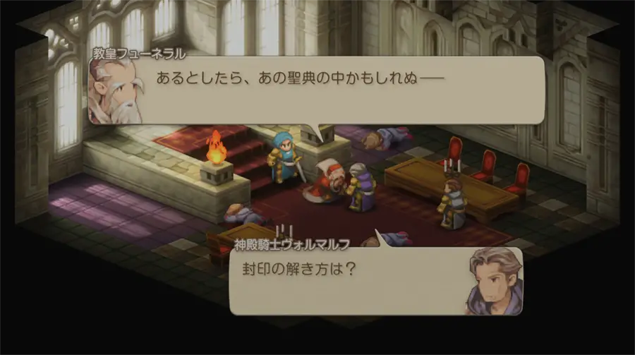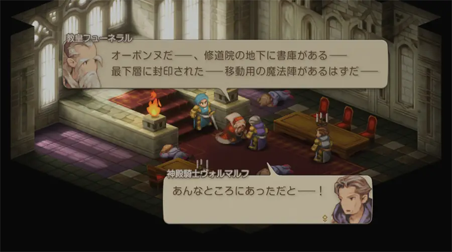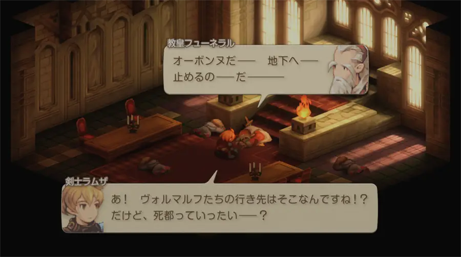 ヴォルマルフを見失ったラムザたちは、城内で息も絶え絶えな教皇フューネラルを発見します。教皇は、ヴォルマルフの行き先がオーボンヌ修道院の地下にある「死都ミュロンド」であり、それを止めるように告げると、息絶えます。