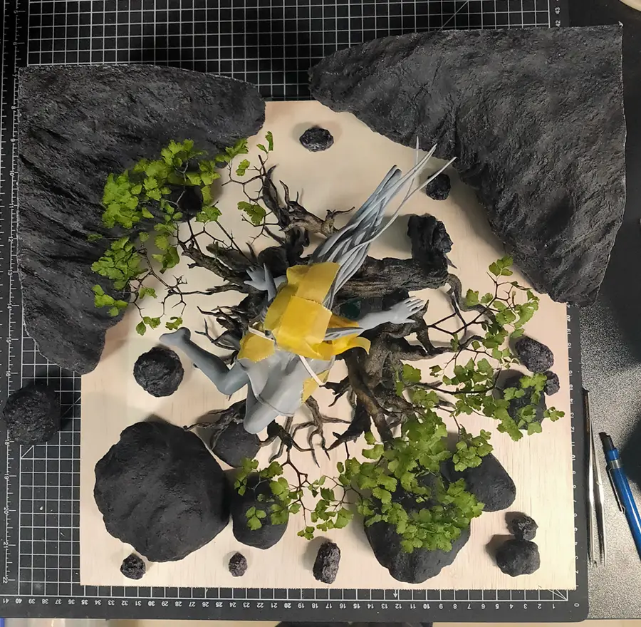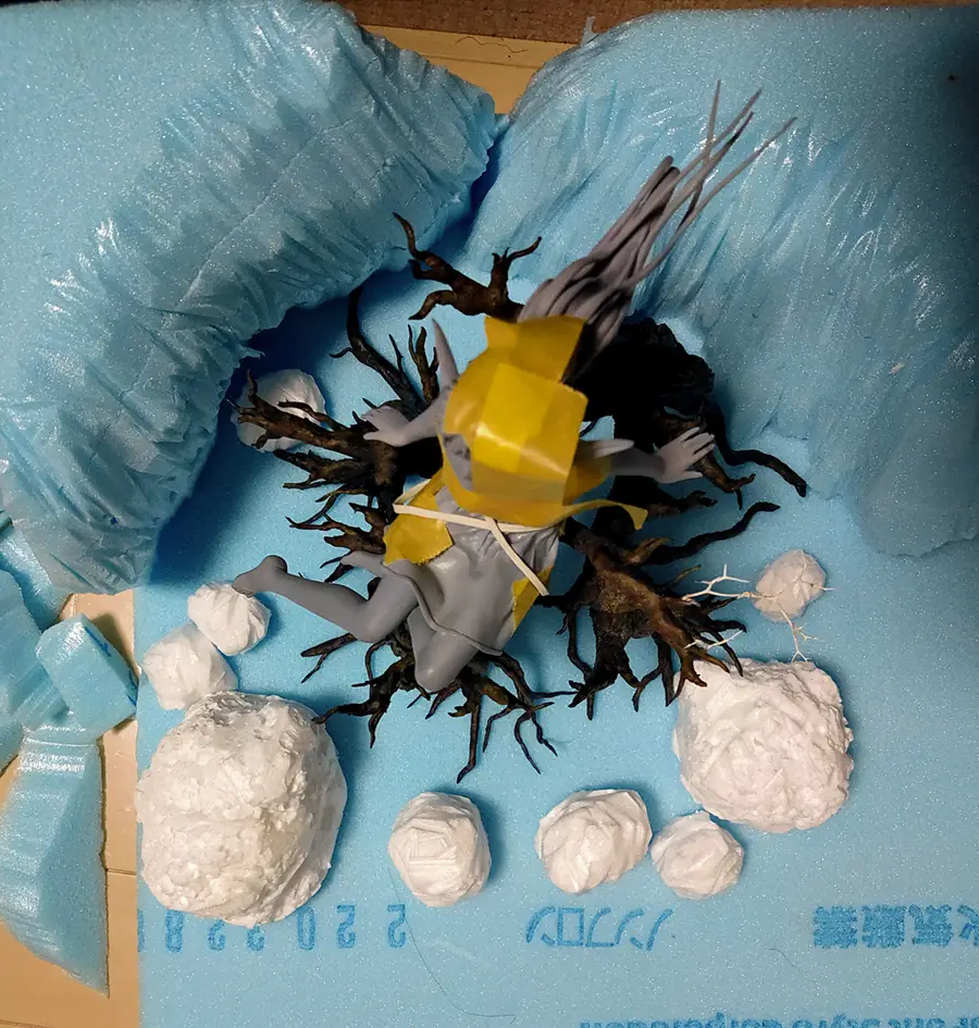 撮影時、画角に対してどのように背景が映り込むのかという点を考えながら、レイアウトしていきます。作りながら感じたことは、とにかく「高さ」が重要だということ。平坦な位置にフィギュアを配置しているだけだと、全体に立体化がなく、見栄えが良くないと感じました。そのため、岩場を作って高さを稼ぎます。地面にならべているのは、ごく普通の発泡スチロールを、普通のカッターで削ったものです。ゴロゴロ岩ですね。