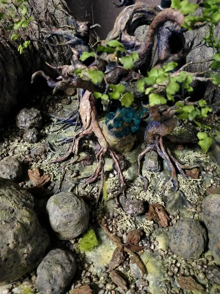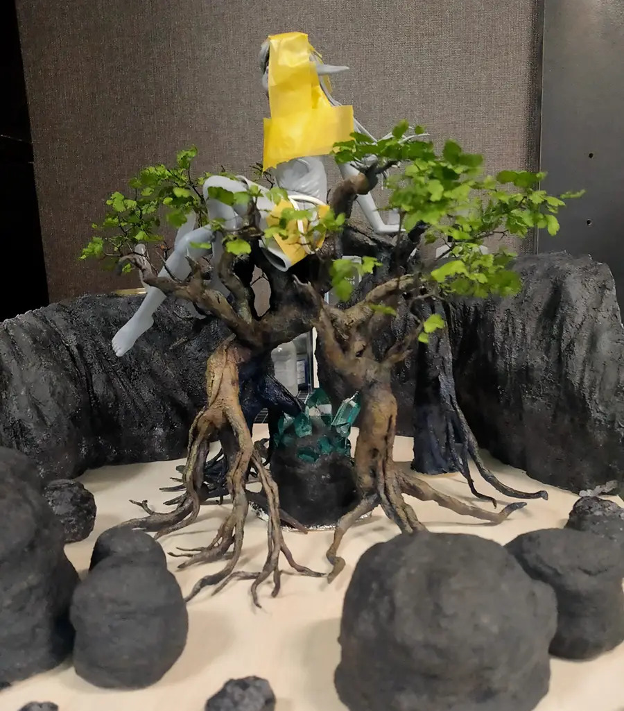 樹木の根っこにはクリスタルを配置しました。ファンタジー感を出したかったのと、コンペで少しでも印象を残すためです。このクリスタルはセリアで売っていた小物です。下から点灯させるつもりだったので、粘土と銀紙で遮光してあります。