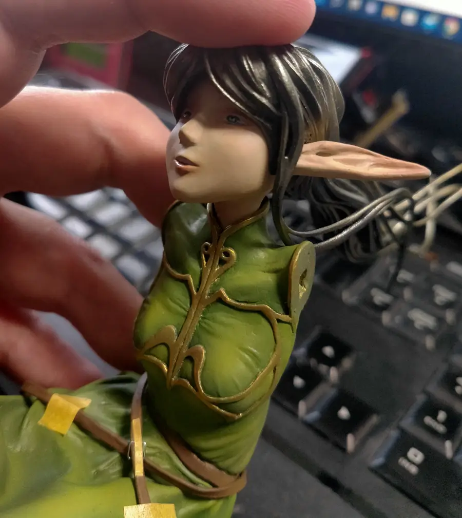 モチーフが「人物である」という点も重要でした。人であれば、髪は伸びるし服は着替えるでしょう。いつも鎧を着て歩いているわけでもありません。イラストと異なった服をきていても、違う髪型であっても、設定的な矛盾はありません。ましてや、ディードリットはハイエルフという1000年以上生きる種族という設定です。1000年以上の寿命ともなると、物語で描かれているのはほんの一瞬にすぎません。世に出ていない多くの部分が、彼女の生活だと考えても不自然ではないでしょう。これは表現の幅などという高尚な話ではなく、「私の技術力で作れないものを回避する」もっともらしい理由にできるということでもありました。