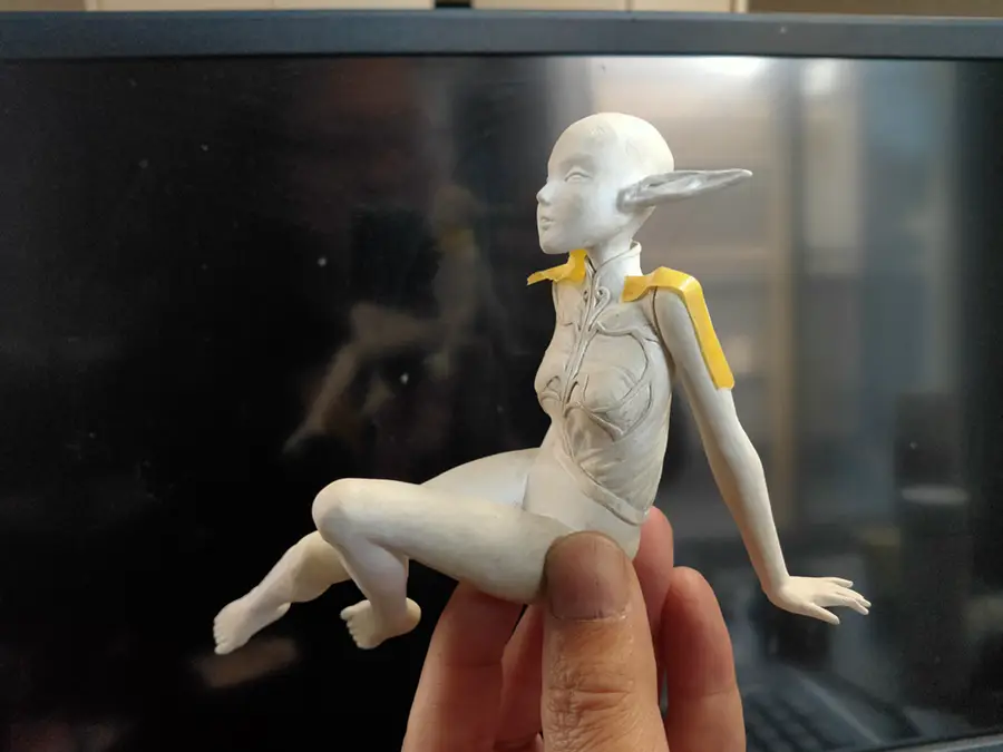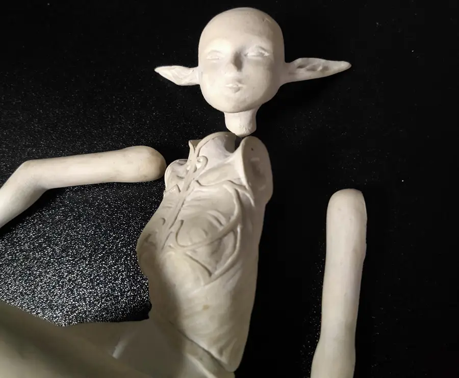服の装飾などは、細くこねて紐状にした粘土を体に這わせるように付け、その後ヤスリで平らにすることで表現しています。Fandoは水に濡らせば溶けてきますので、接着も簡単です。