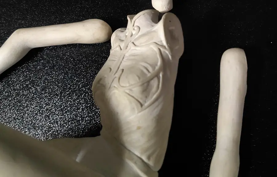 すみません、制作過程のほんとどを撮影していませんでした。突然出来上がった感じで申し訳ないのですが、ひたすら削って盛ってを繰り返した感じです。大まかな形を作ったら、ナイフややすりで少しずつ形を整えてきます。粘土の表面はボコボコしているので、それを滑らかな面に整えてあげます。人体などの有機的なラインはスポンジヤスリがオススメですが、私はほとんど「神ヤス」で仕上げました。プラモでもよくお世話になっています。