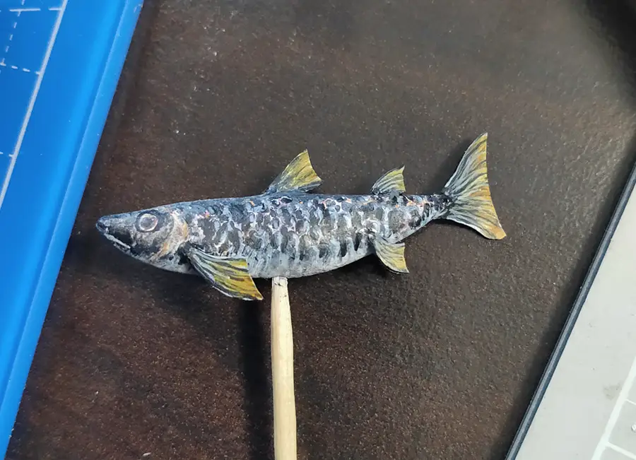 お魚でも作るか…。ということで、100円ショップで樹脂粘土を買ってきて適当にペタペタ。塗装は全てアクリル絵の具です。水底に透明なプラ棒を刺し、浮かせた位置に配置しておけば、水中を泳いでるイメージになるのではないかと。