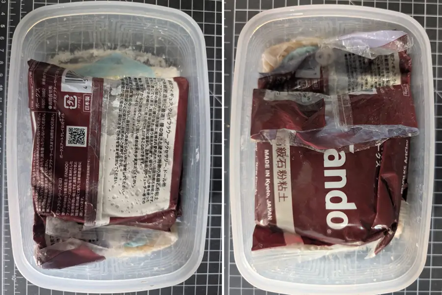 これはNewFandoという、石粉粘土です。汚い写真で申し訳ないですが、実際使っていたものです。乾くと石膏のように硬くなりますが、ある程度の弾力性もあるため、意外と頑丈です。乾いてきても水を足せばに復活するので、長持ちしますよ。価格がお手頃で、失敗を恐れず作れるのも嬉しいところ。初心者にはうってつけの素材です!