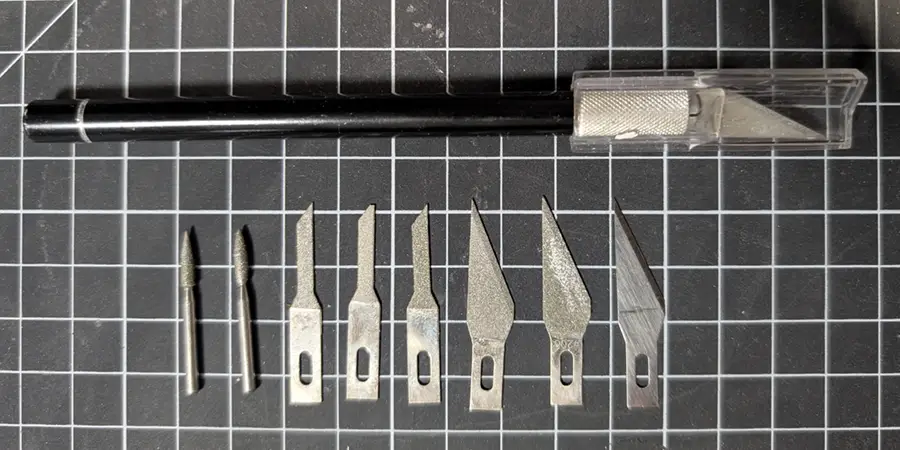 一般的なデザインナイフの形をしたダイヤモンドヤスリです。似たような商品は色々ありますが、最適なヤスリの形状や粒度は、作るものや削りたい場所によって変わってきます。これなら色々セットになっているので、自分に合ったものを探しやすかったです。