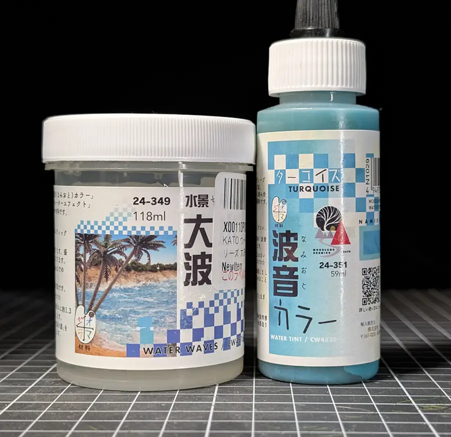 KATOという鉄道模型関連のメジャーなメーカーで、ジオラマ系の素材も多く取り扱っています。波音や大波小波は、ウォーターシステムという水景ジオラマの商品群の一つで、初心者でも安心して使用できます。一般的に水面の表現には、木工ボンドなど乾くと透明になるものが使用されます。それをより簡単に扱えるようにしたのが、大波小波ですね。波音はレジンに色をつけるための着色料です。私は見事に入れ過ぎてしまいましたが、綺麗なターコイズブルーが表現できますよ。