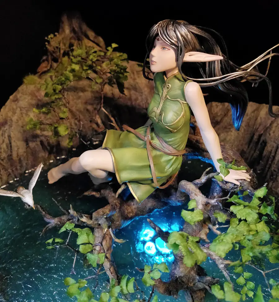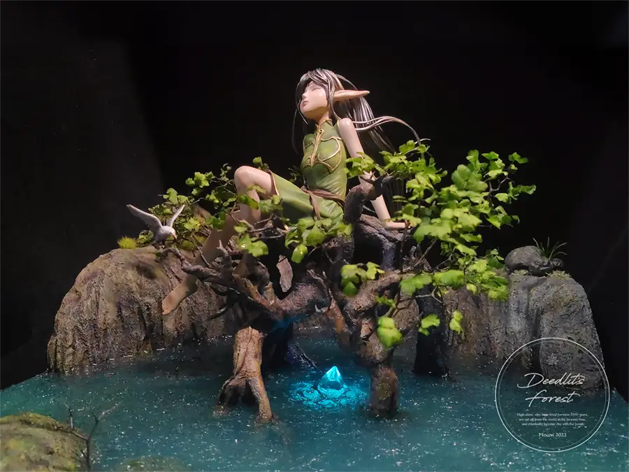 何かに座っているシチュエーションにすることは決めていたものの、額縁のアイディアを破棄したので、どうすべきか悩んでいました。とにかく必要なのは、「このポーズで座れる場所」ということです。先に作ってしまったフィギュアに合わせられるよう、土台は樹木にしました。樹木なら、枝ぶりを自由に調整して台座が作れると考えたためです。エルフは森の生き物ですし、彼女の寿命からすれば、人間よりも木のほうが愛着があるかもしれませんしね。